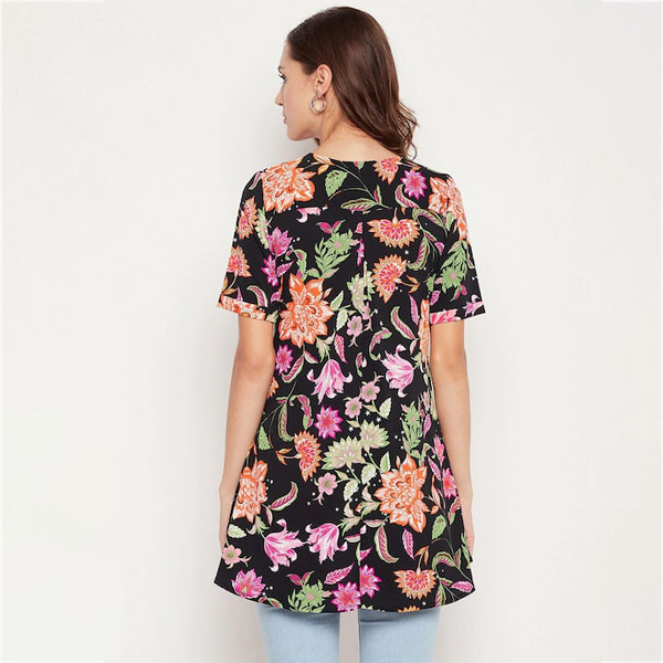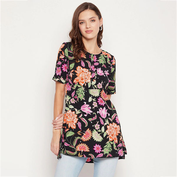 • Black and pink printed tunic ,has a round neck, short sleeves, button closure