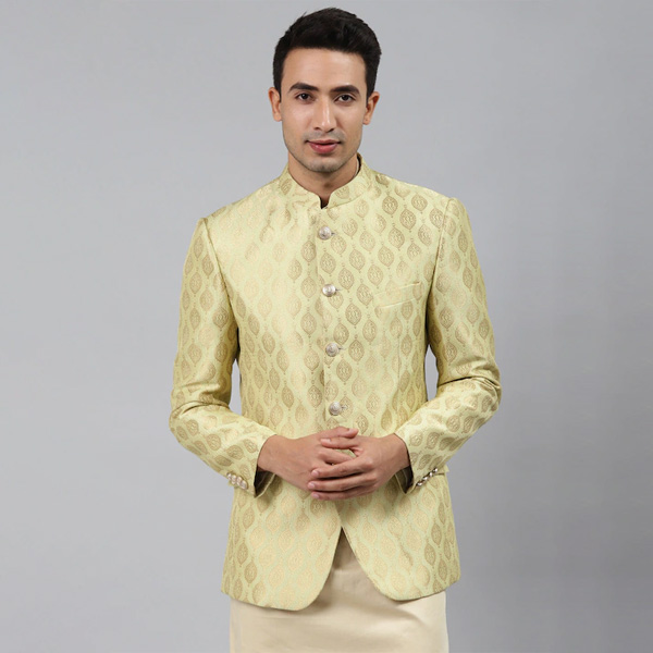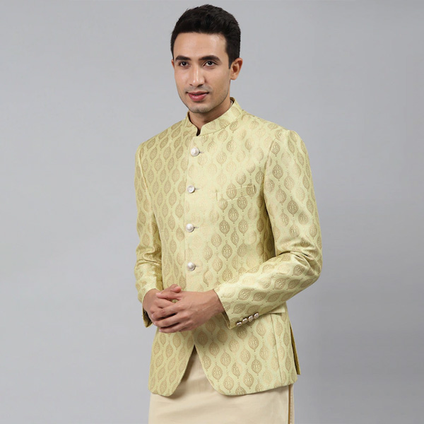 Green self design blazer, has a mandarin collar, single-breasted with button closures, long sleeves, five pockets, double-vented back hem, an attached lining. .